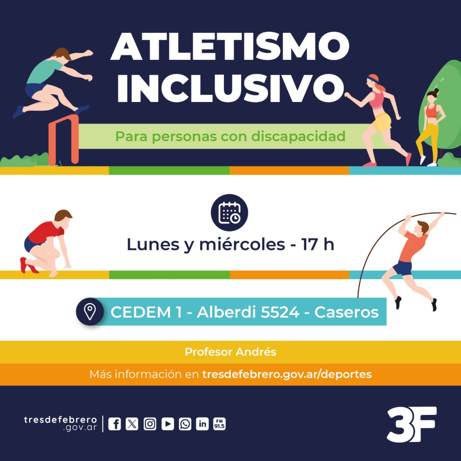 Pero si tu pasión deportiva es la resistencia, velocidad y salto, sumate a atletismo. Por otro lado, si querés practicar el deporte más reconocido en nuestro país, vení a conformar el equipo de fútbol inclusivo que, al igual que atletismo, entrena los lunes y miércoles a las 17 h en el CEDEM 1 (Alberdi 5524 – Caseros).