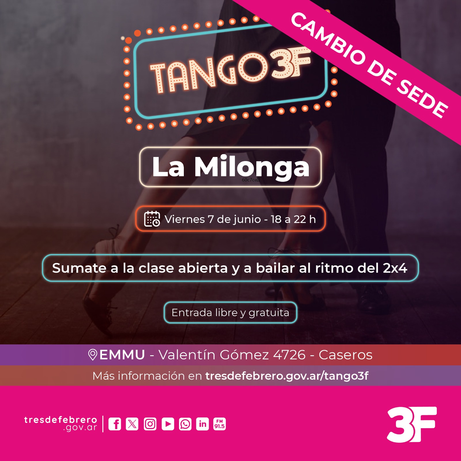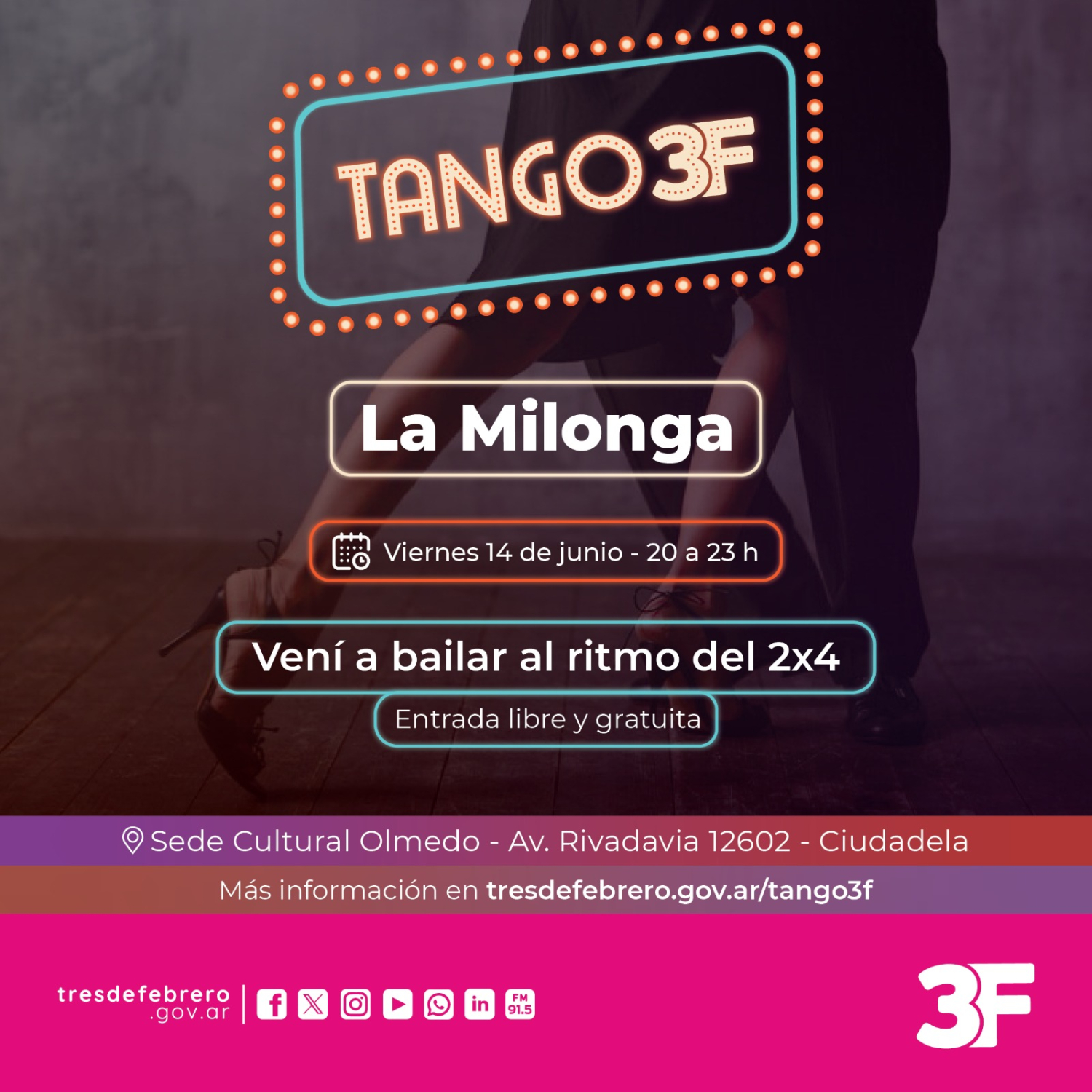 Por otro lado, también podés sumarte a Tango 3F el viernes 7 de junio de 18 a 22 h en la EMMU (Valentín Gómez 4726, Caseros) para ser parte de La Milonga al ritmo del 2×4. En caso de que no puedas asistir o quieras repetir la experiencia, también se realizará el viernes 14 de junio de 20 a 23 h en la Sede Cultural Olmedo (Av. Rivadavia 12602, Ciudadela).