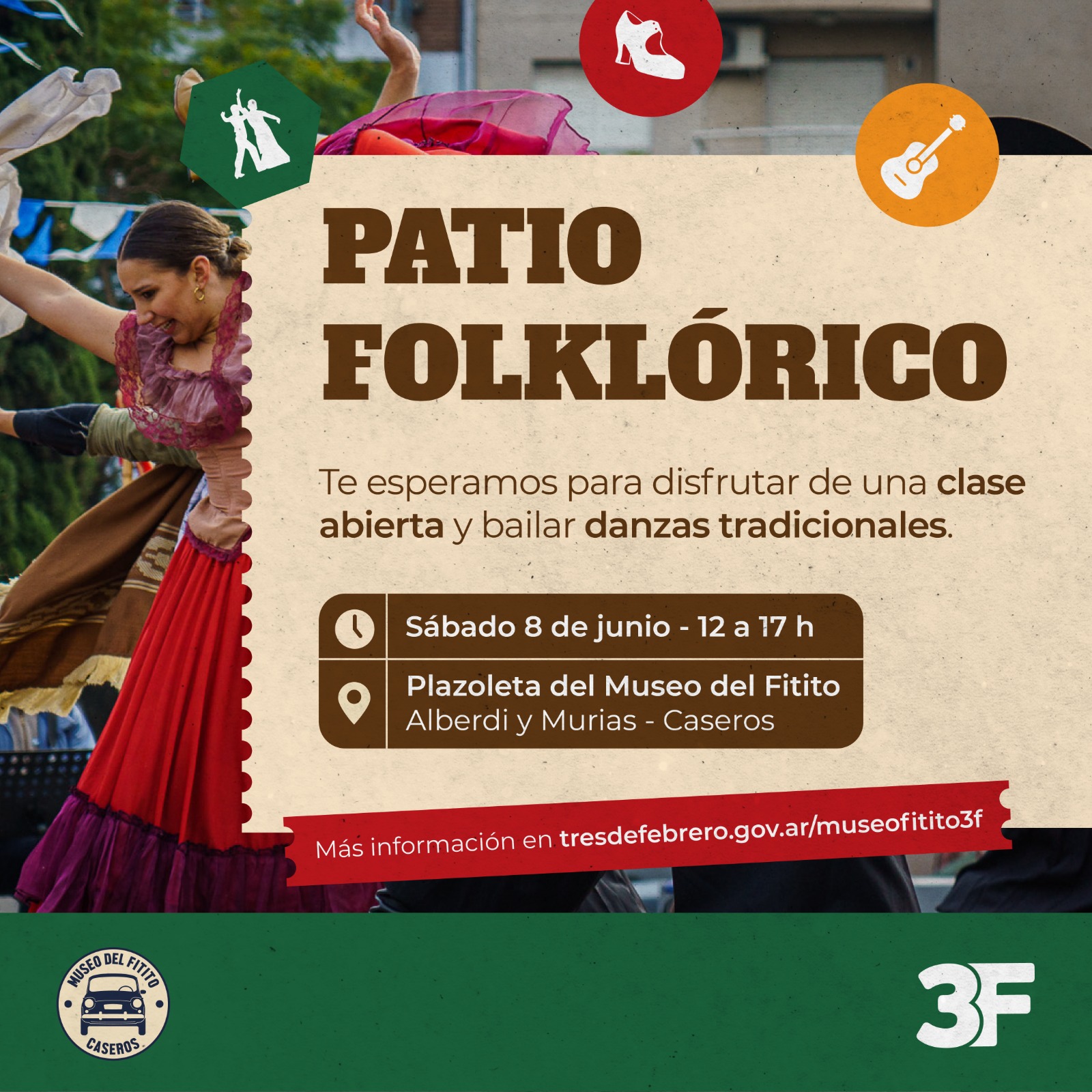 “Tradición y cultura, los componentes que forman esta iniciativa que tanto nos enorgullece”, destacó el Intendente Diego Valenzuela. Es por eso que te esperan el sábado 8 de junio con el Patio Folklórico a partir de las 12 h en la Plazoleta del Museo del Fitito (Alberdi y Murias, Caseros) para divertirte en la clase abierta de esta danza tradicional.