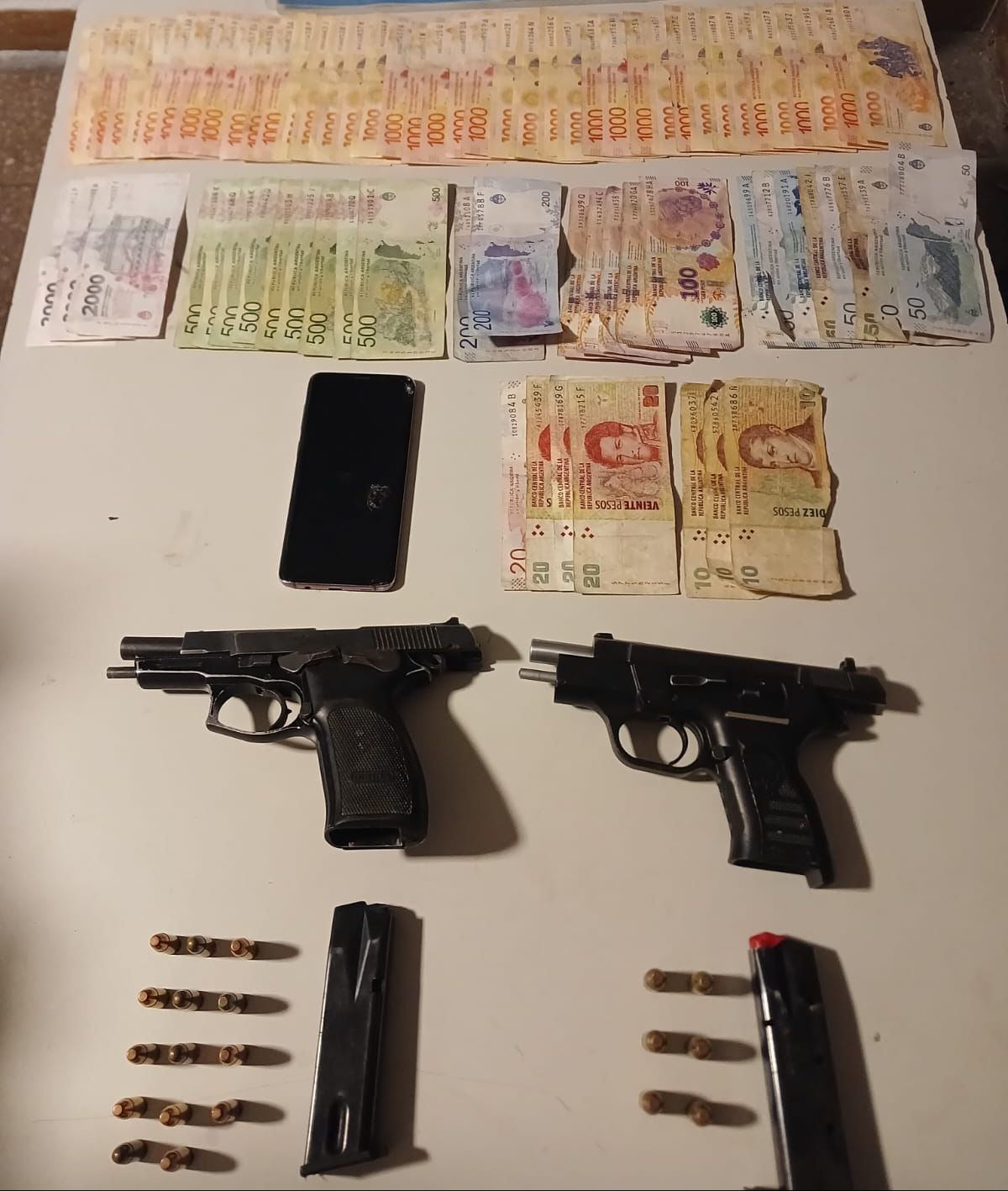 Fue así que los uniformados rastrillaron la zona y detectaron a las dos armas de fuego, aptas para disparo, dos cargadores y veinte cartuchos. Asimismo, al requisar a los dos hombres, de 20 y 37 años y de nacionalidad peruana, se incautaron casi 52 mil pesos y un celular.