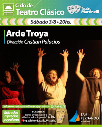 También el 3/8 a las 20h en el Teatro Martinelli se presentará la obra “Arde Troya”, una versión ligeramente payasa de la tragedia griega con: Mercedes Lía Hernández, Lucía Núñez Lodwick y Micaela Picarelli. Entradas a precio popular en la boletería del teatro. (Lavalle 3021)