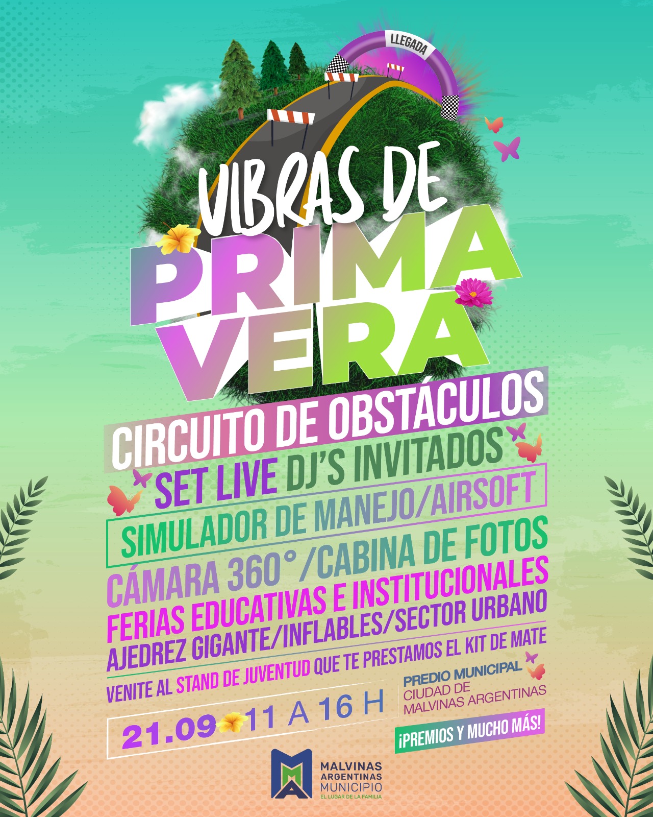 Los humoristas e influencers Sabri y Benca serán los conductores de “Vibras de Primavera”. Durante todo el encuentro se dará un Set Live con DJs y el cierre lo dará Bianca Lif. Los chicos podrán participar de un Circuito de Obstáculos, donde podrán ganar premios para sus escuelas. El circuito estará compuesto por diez postas: telaraña, ruedas, vallas, jungla, pato al agua, laberinto, inflables, arcoiris y polvo de colores. Las inscripciones para el mismo se realizan en el sitio web del municipio: www.malvinasargentinas.gob.ar