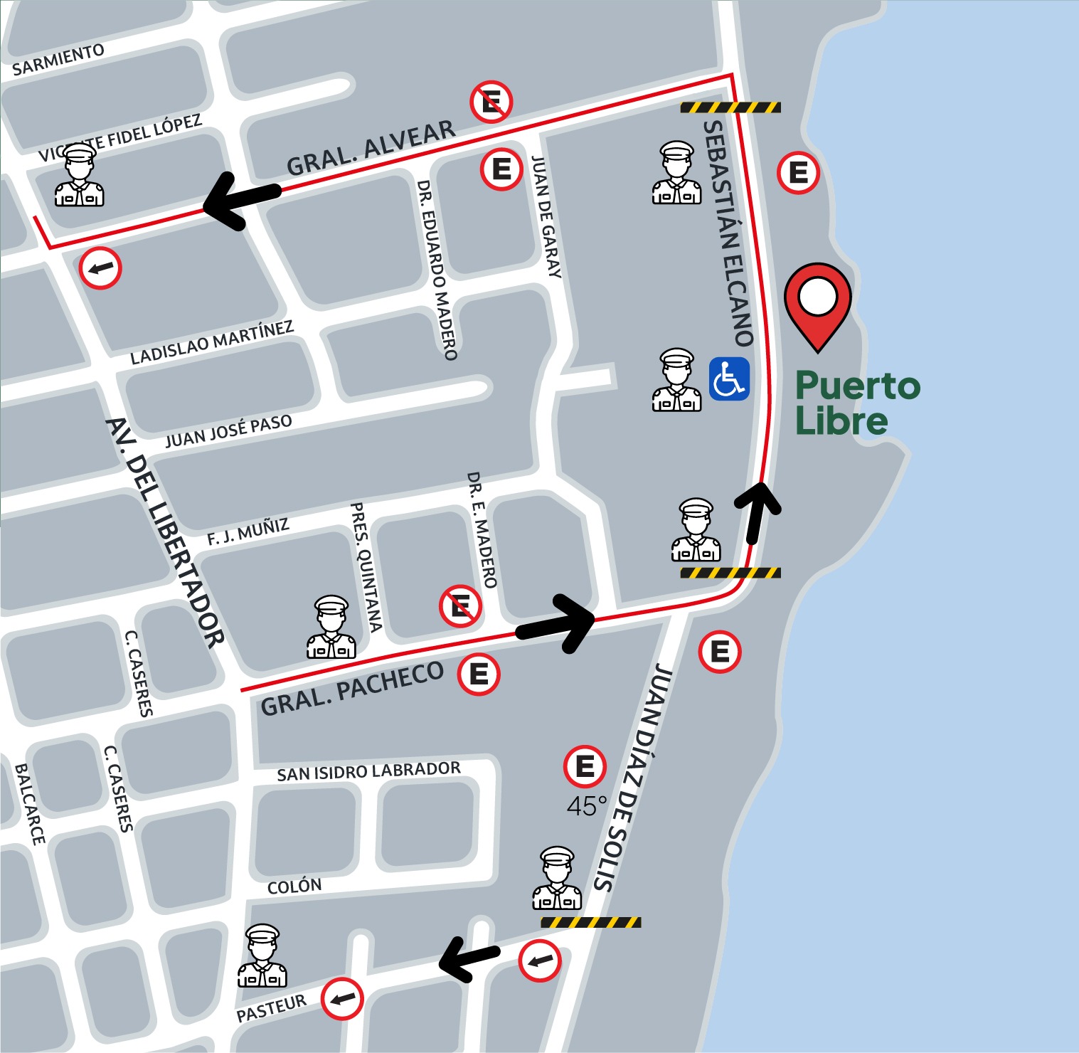 Circuito de recorrido de micros (Entrando por Gral. Pacheco, Sebastián Elcano, Gral. Alvear, Av. del Libertador).