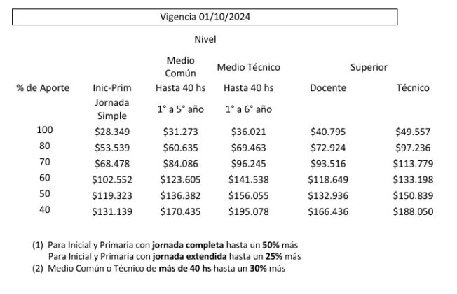 La Asociación de Institutos de Enseñanza Privada de Buenos Aires (Aiepba) informó que las autoridades de la Provincia de Buenos Aires y de la Ciudad Autónoma habilitaron nuevos cuadros arancelarios para los colegios privados con aporte estatal que regirán a partir del 1ro de octubre. Será de 4,% en el territorio provincial y del 3.1% en la Capital Federal.