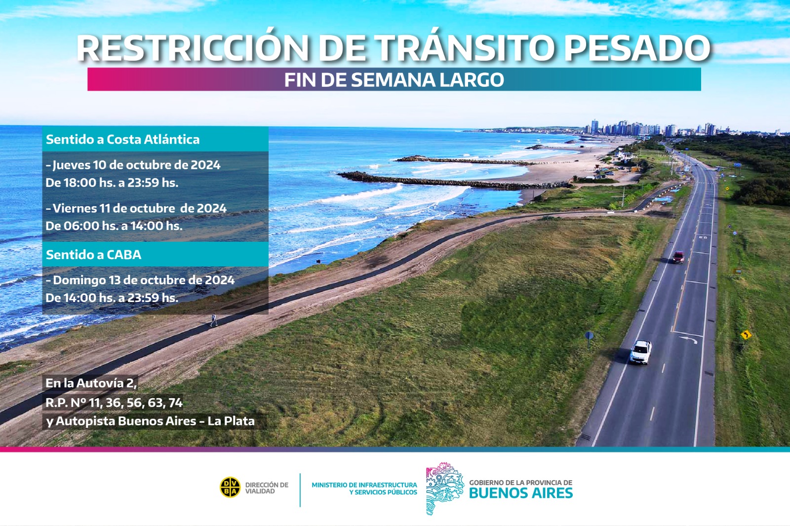 La Dirección de Vialidad de la Provincia de Buenos Aires, dependiente del Ministerio de Infraestructura y Servicios Públicos, comunica que, debido al feriado turístico por el Día de la Diversidad Cultural, los días jueves 10, viernes 11 y domingo 13 de octubre, se restringirá la circulación de camiones con carga de más de 7 (siete) toneladas de porte bruto en la Autovía 2, las Rutas Provinciales Nº11, Nº36, Nº56, Nº63, Nº74, y la Autopista Buenos Aires–La Plata, con el objetivo de facilitar el desplazamiento vehicular y prevenir siniestros de tránsito en rutas turísticas.