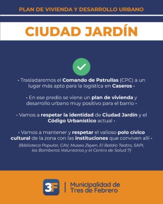 En Ciudad Jardín se trasladará el Comando de Patrullas (ubicado sobre la calle Boulevard Finca) para disponer de ese espacio para la construcción de nuevas viviendas que respeten completamente la identidad característica del barrio, el Código Urbanístico actual y las instituciones que conviven en ese lugar: Biblioteca Popular, CAV, Museo Zeyen, el Baldío Teatro, SAPI, los Bomberos Voluntarios y el Centro de Salud 7. Además, los recursos que se generen serán utilizados en obras que mejoren el barrio. En tanto, el CPC se mudará a un predio en Caseros, un lugar más apto para la logística que amerita el comando. Finalmente, se completará otro plan de viviendas en los terrenos lindantes a los Altos de Podestá, a la vera del arroyo Morón.