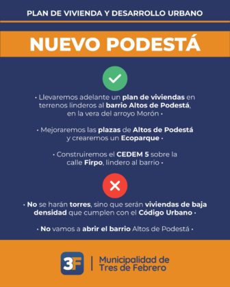 No se harán torres, sino viviendas de baja altura que cumplen con el Código Urbano. Esto va a permitir generar recursos para construir el CEDEM 5 y mejorar el espacio público con la renovación de las plazas y la creación de un Ecoparque en Altos de Podestá. También obras de integración socio urbana, hidráulicas y de pavimento en la zona norte del distrito.