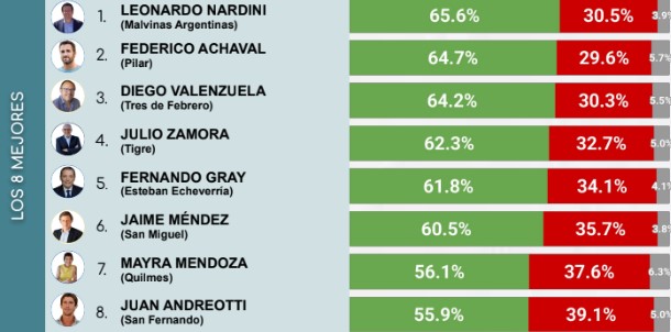 Los que completan el podio de visión favorable son Leonardo Nardini de Malvinas Argentinas con 65,6% y Federico Achaval de Pilar con 64,7%. En contraste, los tres que obtuvieron mayor imagen negativa son Pablo Descalzo de Ituzaingó con 57,9%, Damián Selci de Hurlingham con 56,2% y Julián Álvarez de Lanús con 59%.