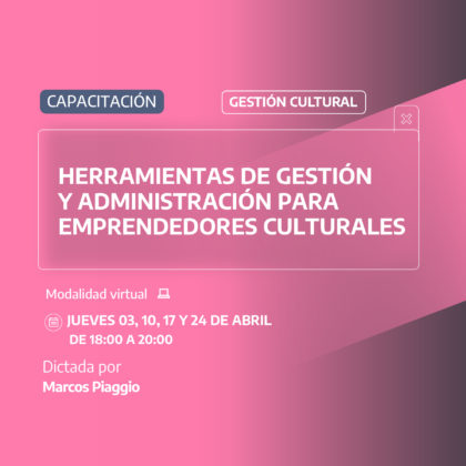 En cuanto a gestión cultural, habrá un espacio dedicado a las “Herramientas de gestión y administración para emprendedores culturales”,  a cargo de docentes del Banco Provincia y Estudio 1: Santiago Spinelli, Lautaro Garcia, Marcos Piaggio y Ramiro Aragón Paz. La propuesta es brindar habilidades y conocimientos necesarios para gestionar y administrar. Será los jueves 3, 10, 17 y 24 de abril, de 18:00 a 20:00.
