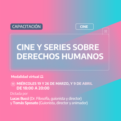 Una de estas capacitaciones será sobre  “Cine y series sobre Derechos Humanos” y el docente será el director y guionista Tomas Sposato. Se ofrecerán las herramientas para lograr una realización audiovisual mediante el estudio de la historia y sus archivos. Se realizará los miércoles 19 y 26 de marzo, y el 9 de abril, de 18:00 a 20:00.