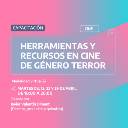 También se realizará el curso “Herramientas y recursos en cine de género terror”, a cargo del director y guionista Javier Valentin Diment, donde se analizarán distintas películas, argentinas e internacionales, para analizar las herramientas que se valieron sus autores para conseguir sus efectos: recursos de sonido, puesta de cámara, efectos especiales, actuación, ritmo y manejo de información. Será los martes 1, 8, 15 y 22 de abril, de 18:00 a 20:00.