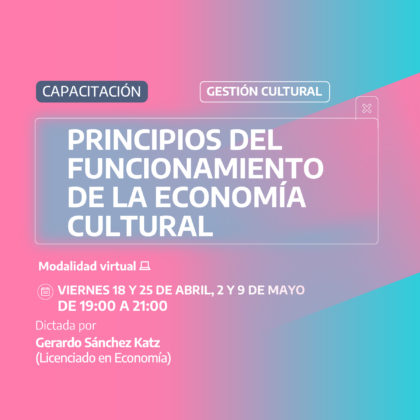 En relación a la misma temática, además se brindará el seminario “Principios del funcionamiento de la economía cultural”, a cargo del Licenciado en Economía Gerardo Sánchez Katz.  Será los viernes  18 y 25 de abril, junto al 2 y 9 de mayo, de 19:00 a 21:00.