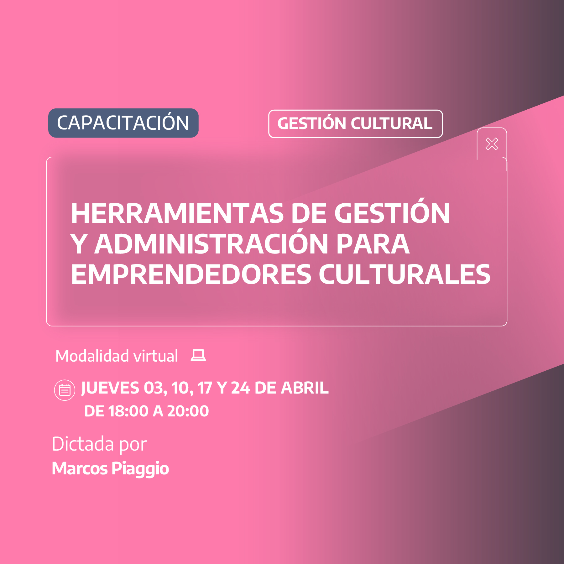 En cuanto a gestión cultural, habrá un espacio dedicado a las “Herramientas de gestión y administración para emprendedores culturales”,  a cargo de docentes del Banco Provincia y Estudio 1: Santiago Spinelli, Lautaro Garcia, Marcos Piaggio y Ramiro Aragón Paz. La propuesta es brindar habilidades y conocimientos necesarios para gestionar y administrar. Será los jueves 3, 10, 17 y 24 de abril, de 18:00 a 20:00.