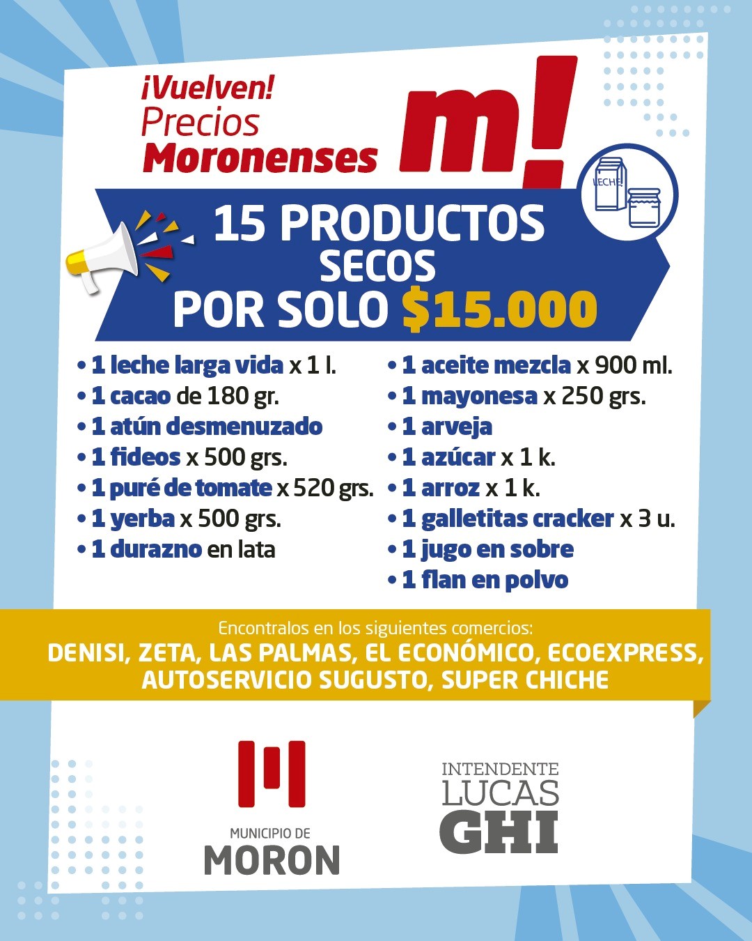 Con el fin de acercar mejores precios a los hogares e impulsar el crecimiento del comercio local, el Municipio de Morón renovó el programa “Precios Moronenses”. Para este año, se trata de una canasta de productos secos, una de productos frescos y otra de productos de limpieza.