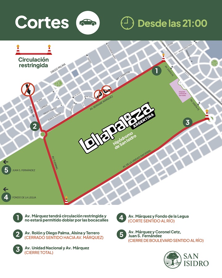 Habrá tres accesos peatonales: serán por la esquina de las avenidas Santa Fe y Márquez; por Av. Márquez al 900, en la entrada Paddock del Hipódromo; y por Av. Márquez a la altura de la entrada oficial del Hipódromo. Los autos ingresarán al estacionamiento por Av. Santa Fe y Av. de la Unidad Nacional, y Av. Fleming y Av. Márquez. El Municipio recomienda a los vecinos evitar circular por esta zona durante el festival.