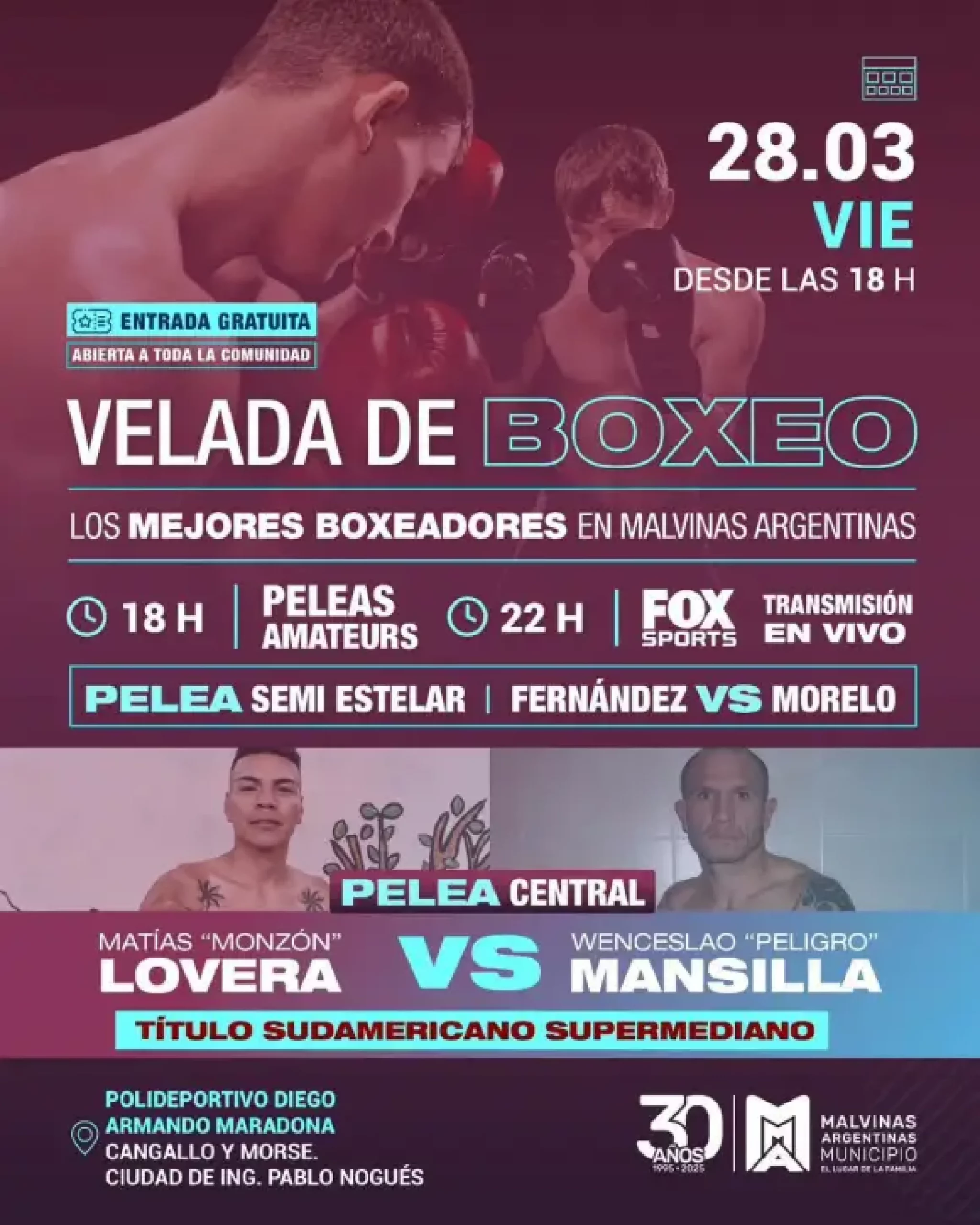 El municipio de Malvinas Argentinas se prepara para una gran velada de boxeo con Argentina Boxing, un evento que reunirá a destacados boxeadores argentinos en el Polideportivo Diego Armando Maradona (Morse y Cangallo, ciudad de Ing. Pablo Nogués). La cita es el viernes 28 de marzo a partir de las 19.30 horas, con entrada libre y gratuita. La transmisión en vivo estará a cargo de Fox Sports desde las 21.00 horas para Argentina y todo el continente.