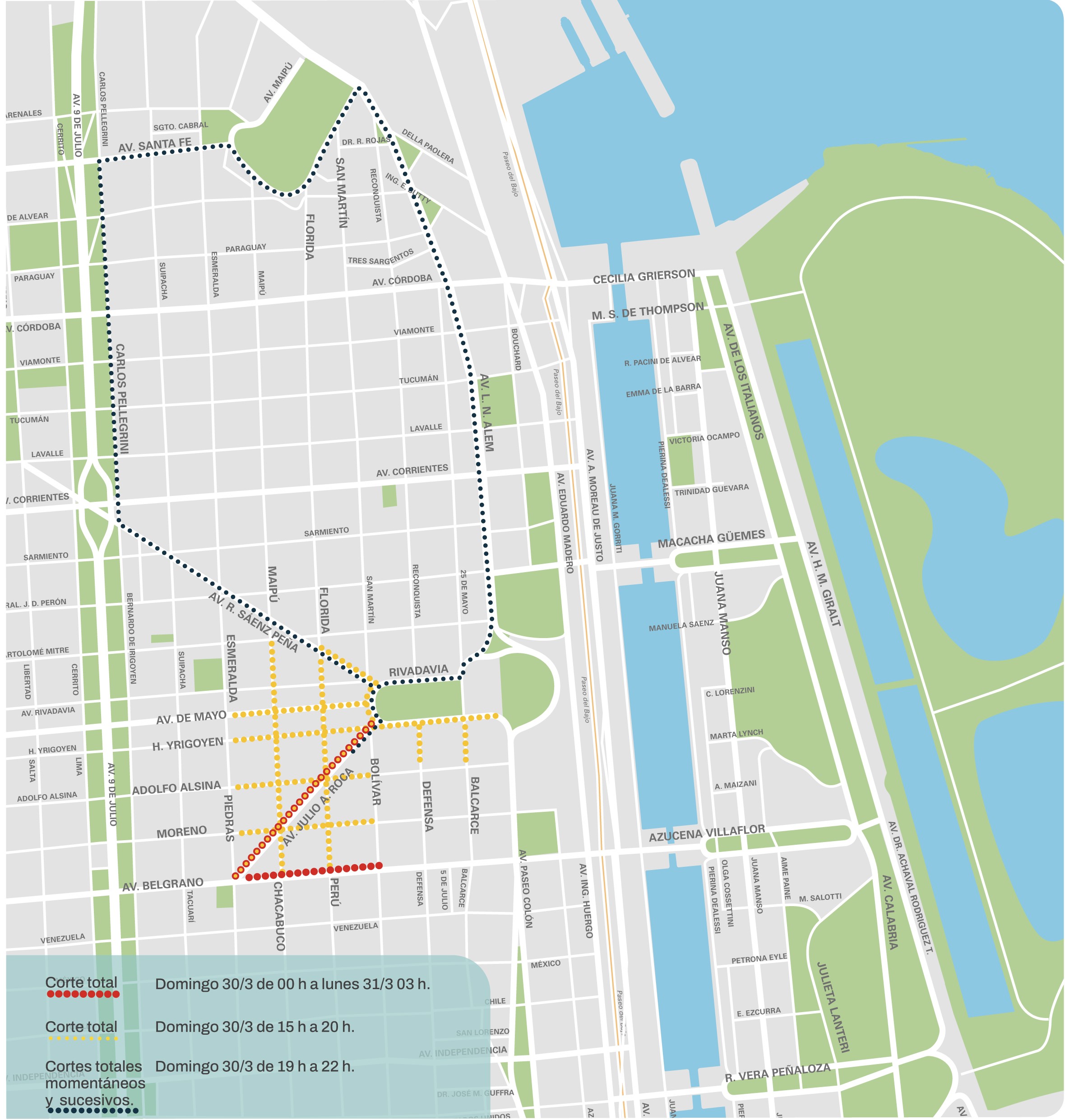 - Cortes totales, momentáneos y sucesivos partiendo desde la Av. Presidente Julio Argentino Roca entre Perú y Bolívar, Av. Presidente Roque Sáenz Peña, Carlos Pellegrini, Av. Santa Fe, Florida, San Martín, Av. Leandro N. Alem, Av. Rivadavia, Bolívar, Av. Pres. Julio Argentino Roca hasta el punto de partida, y cierres totales, momentáneos y sucesivos de las arterias transversales a la hora del paso de los participantes.