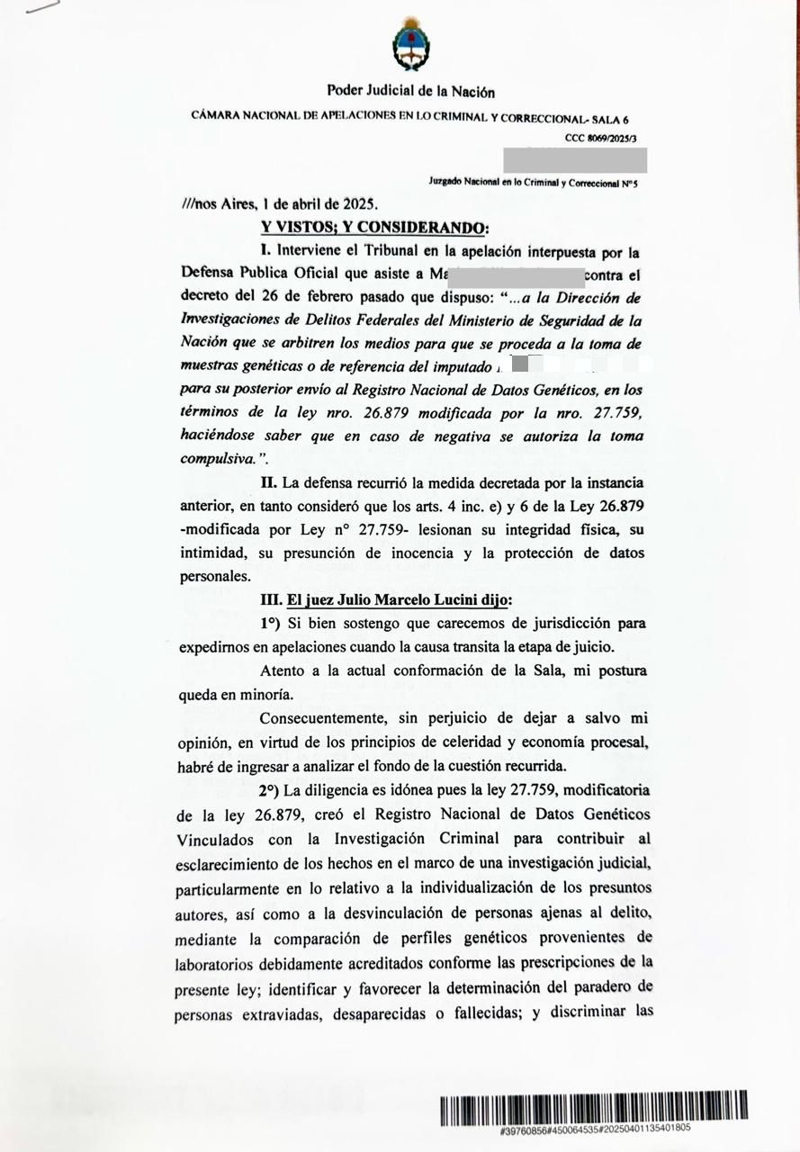 El caso, caratulado CCC 8069/2025/3 – BMF se convirtió en un antecedente clave. La defensa pública oficial del imputado había cuestionado la constitucionalidad de los artículos 4º inc. e) y 6º de la Ley 26.879 (modificada por la Ley 27.759), argumentando que la toma compulsiva de ADN lesionaba derechos fundamentales como la intimidad, la integridad física, la protección de datos personales y la presunción de inocencia.