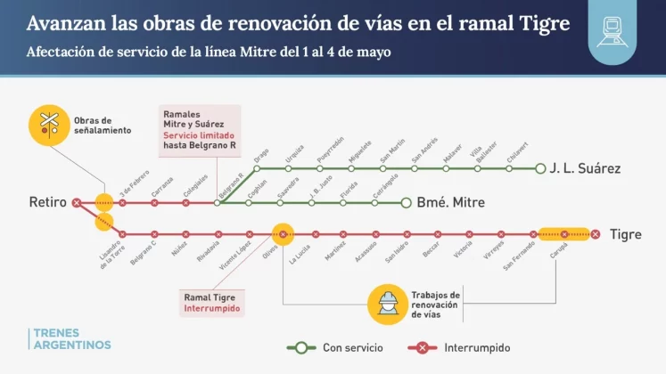En ese sentido, durante el fin de semana largo, entre el 1° y 4 de mayo, el ramal Tigre estará interrumpido; mientras que los ramales Bartolomé Mitre y José León Suárez funcionarán limitados hasta Belgrano R.