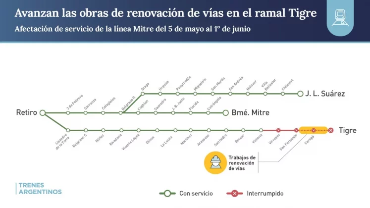 A su vez, desde el lunes 5 de mayo y hasta el 1° de junio, el ramal Tigre funcionará limitado entre Retiro y Victoria sin llegar a la estación cabecera Tigre.