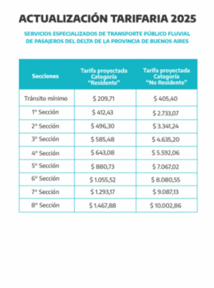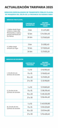 El Ministerio de Transporte pone en conocimiento público los cuadros tarifarios actualizados del transporte público fluvial de pasajeros del Delta bonaerense que regirán desde su publicación en el Boletín Oficial.