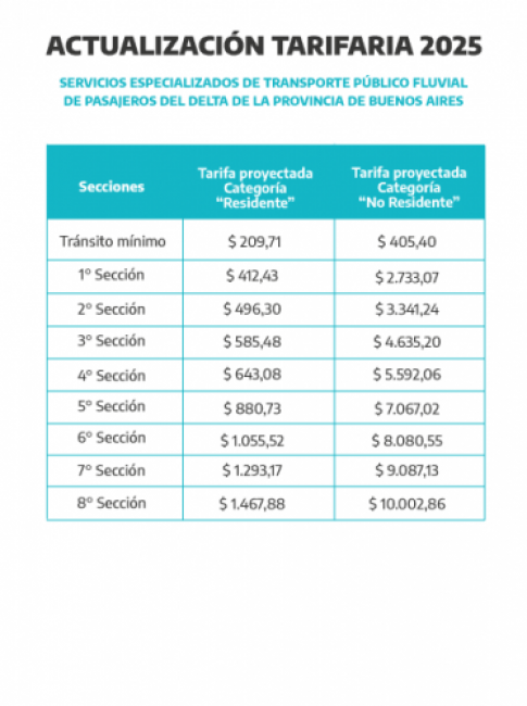 En el marco de la actualización tarifaria que se aplica a los servicios de transporte público fluvial de pasajeros de jurisdicción provincial, se resalta la importancia del servicio regular público fluvial de pasajeros para la población del Delta Bonaerense y el turismo del área de influencia, siendo imprescindible alcanzar una recomposición tarifaria con el fin de eliminar las disparidades de costos a cargo de las personas usuarias, haciendo extensivo dicho análisis a los servicios especializados en categorías Taxi y Excursión.