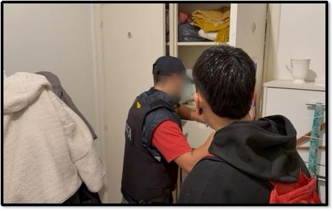 Con la autorización judicial correspondiente, los policías ingresaron al inmueble ubicado sobre la calle Villegas al 3000, donde procedieron a la detención del implicado: un ciudadano argentino de 35 años y al secuestro de un teléfono celular.