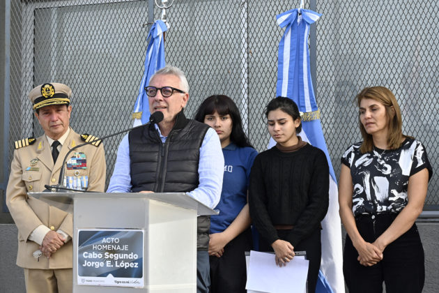 A su tiempo, Osvaldo Aguirre señaló: “Para la Prefectura Naval es un honor estar acá, más en esta escuela, que sabemos que fue impuesta con el nombre de Jorge Eduardo López. Él murió a bordo de una embarcación y fue uno de los tantos fallecidos identificados por la placa que decía, Soldado argentino, sólo conocido por Dios . Esta memoria jamás debe fallecer, nunca debe morir. Debemos estar siempre trabajando con los colegios, Julio Zamora realmente es un malvinero de primera y siempre tenemos su apoyo”.
