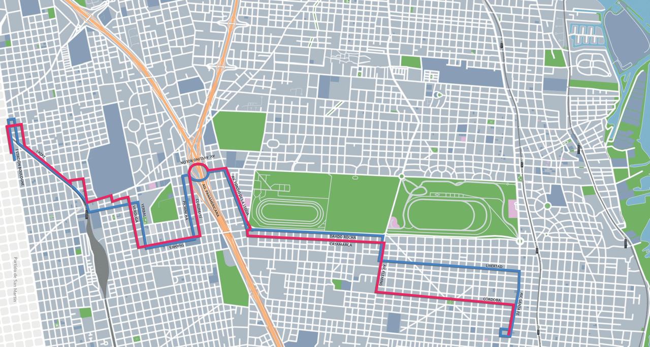 IDA: Andrés Lamas y El Zorzal – Andrade – Sarratea – Plácido Marín – 14 de Julio – Yatay – Raúl Scalabrini Ortiz – Godoy Cruz – Yerbal – Thames – Pichincha – Av. Avelino Rolón – Fondo de La Legua – Dardo Rocha – Av. Sir Alexander Fleming – Libertad – Av. Santa Fé – Vélez Sarsfield – Tres Sargentos – Santiago del Estero – Av. Santa Fé – hasta Gral. Alvear donde termina el recorrido.