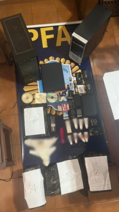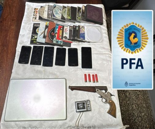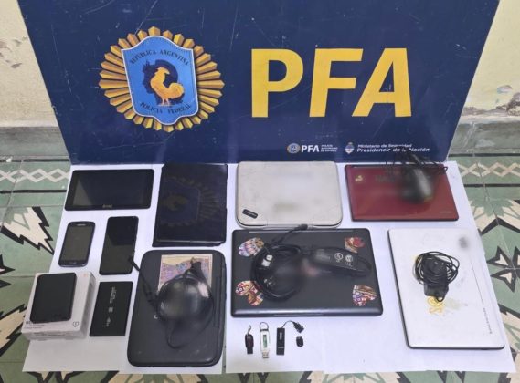 Asimismo, se secuestraron 125 aparatos de telefonía celular, 38 notebooks, 31 computadoras de escritorio, 8 tablets, 2 routers, 31 discos rígidos extraíbles, 31 pendrives, 7 adaptadores de memoria, 8 tarjetas micro Sd, 2 cámaras filmadoras, una cámara web, una caja de zapatos conteniendo en su interior 42 prendas íntimas femeninas de diversos tamaños, colores y modelos, 2 cajas de preservativos, un juguete sexual, un pistolón con varios cartuchos con posta de guerra calibre 14, una pistola calibre 22 con formato de lapicera y un revólver calibre 38 Special.