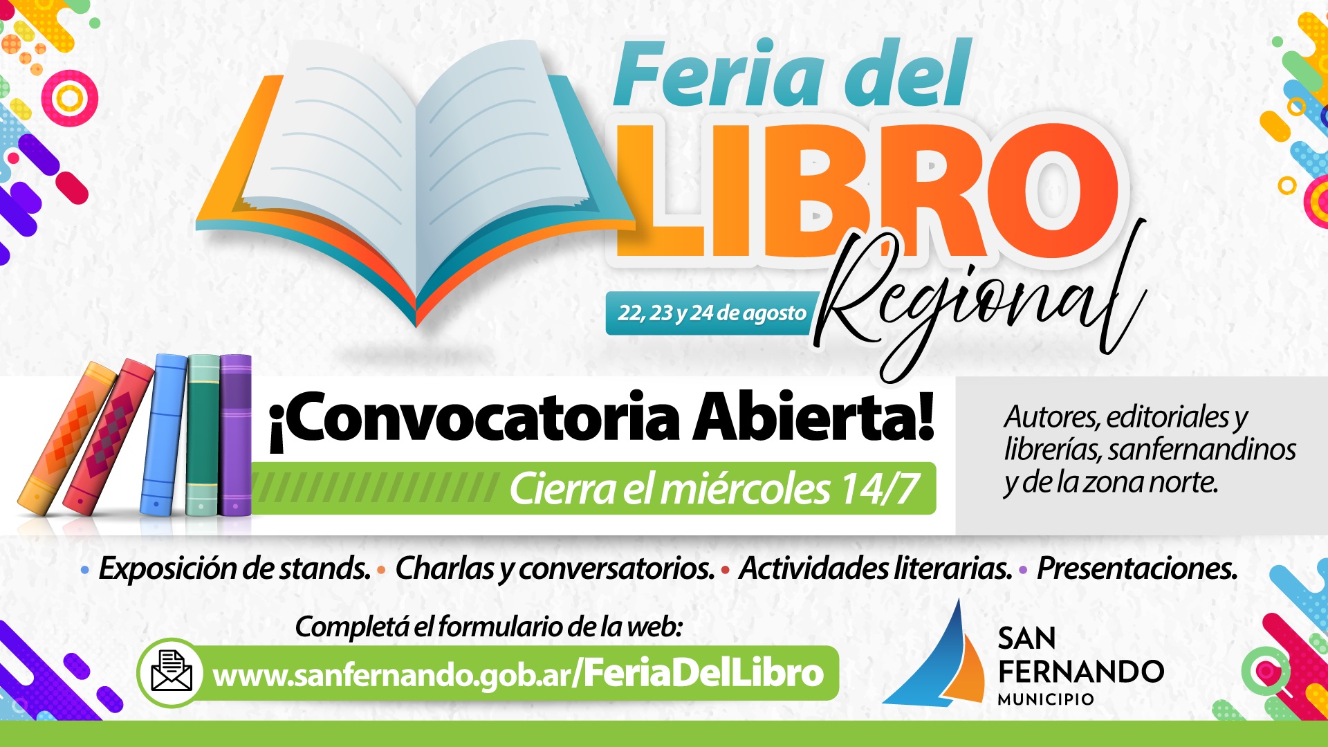 Los interesados en participar pueden consultar la información completa y completar el formulario de inscripción al evento en www.sanfernando.gob.ar/FeriaDelLibro, destacando que esta convocatoria cierra el 14 de julio próximo.