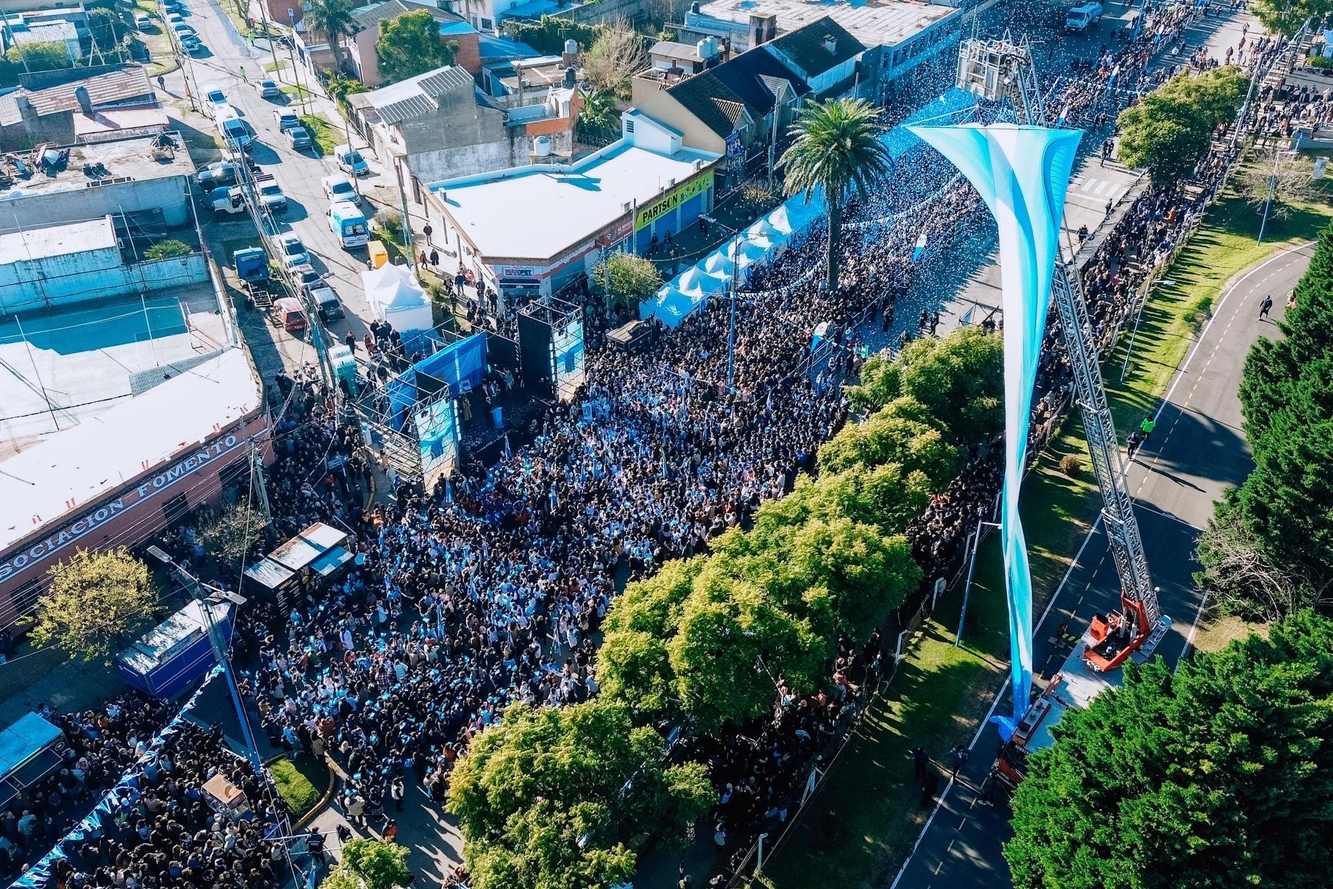 Desde temprano, el intendente Ariel Sujarchuk encabezó el acto central y tomó la promesa de lealtad a la Bandera a más de 3.000 estudiantes de 4º grado de escuelas públicas y privadas del distrito. El emotivo momento fue acompañado por la interpretación musical de “Bandera de mi Patria” a cargo de los propios alumnos, un show de danza y el izamiento de una bandera de 50 metros confeccionada por una vecina del distrito. La ceremonia fue bendecida por el padre Lucas Martínez, de la parroquia Santa Teresa de Jesús.