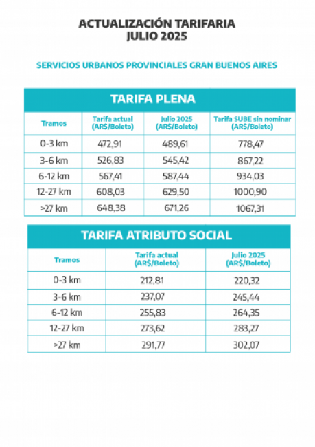 De conformidad con los artículos 4° y 5° de la Resolución N° 81/25, se ponen en conocimiento los cuadros tarifarios actualizados para los servicios de GBA (aledaños a CABA) y del Gran La Plata en base al IPC.