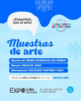 Por otro lado, en el Salón Municipal de Exposiciones León Gallardo, habrá muestras de arte del “Museo de las Mariposas del Mundo”, de “Fileteado porteño» y otras opciones, de lunes a viernes de 10 a 17 hs.