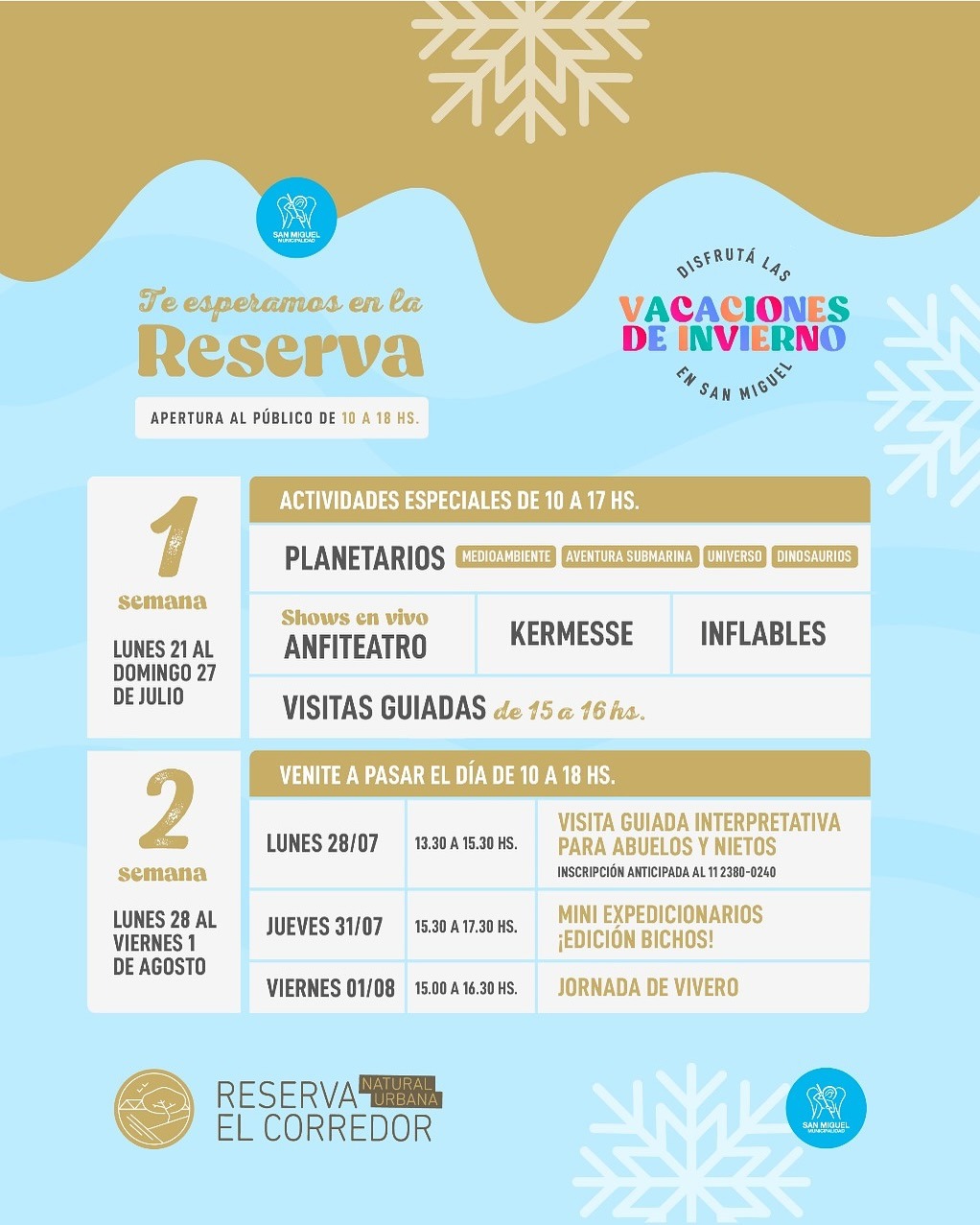 Para los amantes de la naturaleza, podrán disfrutar de distintas actividades en la Reserva Natural Urbana “El Corredor”, que incluyen planetarios, shows, kermesse, inflables, visitas guiadas y mucho más, del 21 de julio al 1ro de agosto, de 10 a 18 hs.