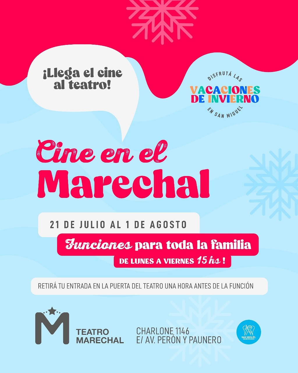 También el cine llega al Teatro Marechal (Charlone 1146, entre Av. Perón y Paunero), con funciones para toda la familia de lunes a viernes, a las 15 hs. Las entradas son gratuitas y se retiran una hora antes de la película en la puerta del teatro.