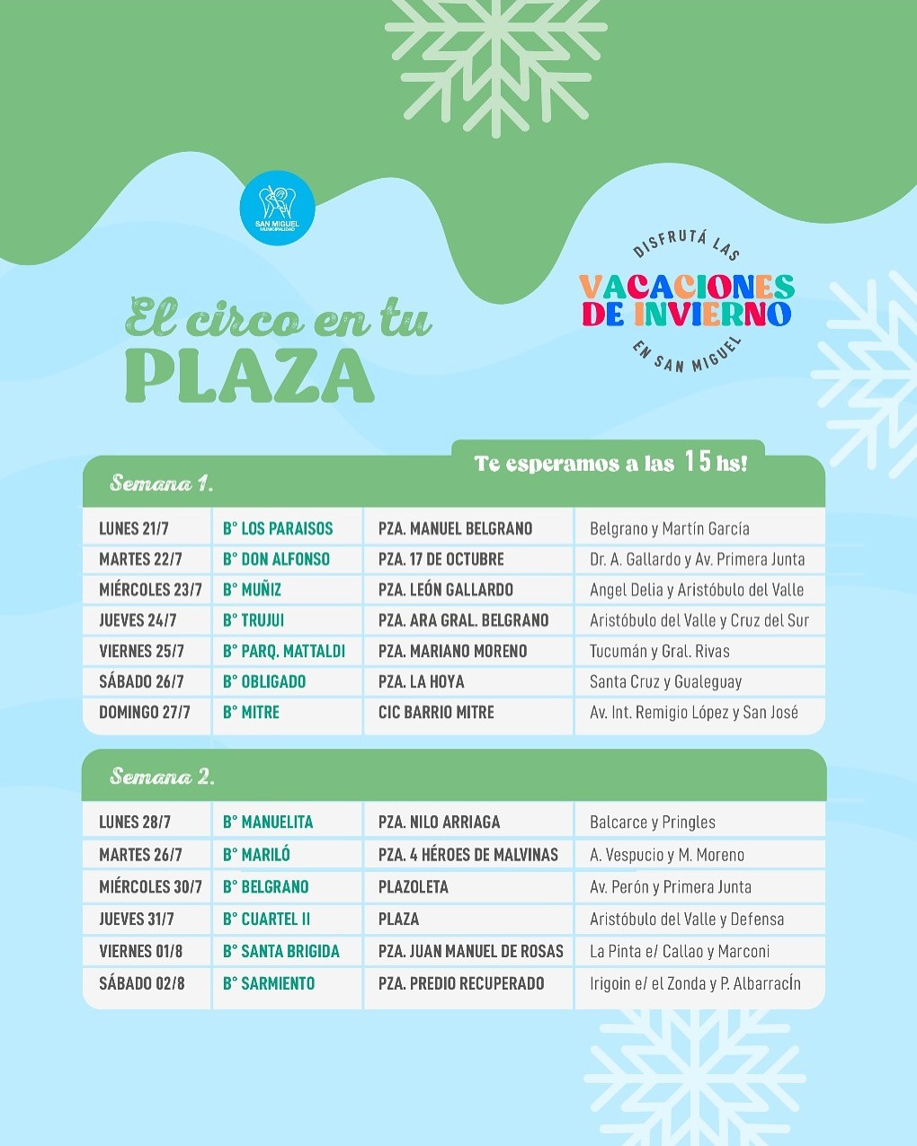 A su vez, se ofrecerán shows de circo, acrobacias y malabares en plazas de todo el distrito, del 21 de julio al 1ro de agosto, a las 15 hs.