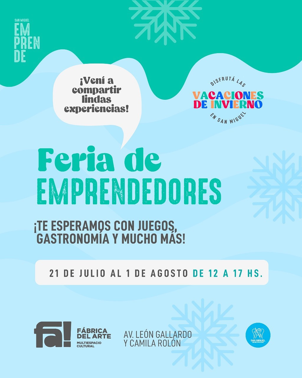 Además, en la FA también se realizará una feria de emprendedores de 12 a 17 hs, con varios stands, gastronomía y juegos, entre otras novedades, del 21 de julio al 1ro de agosto.