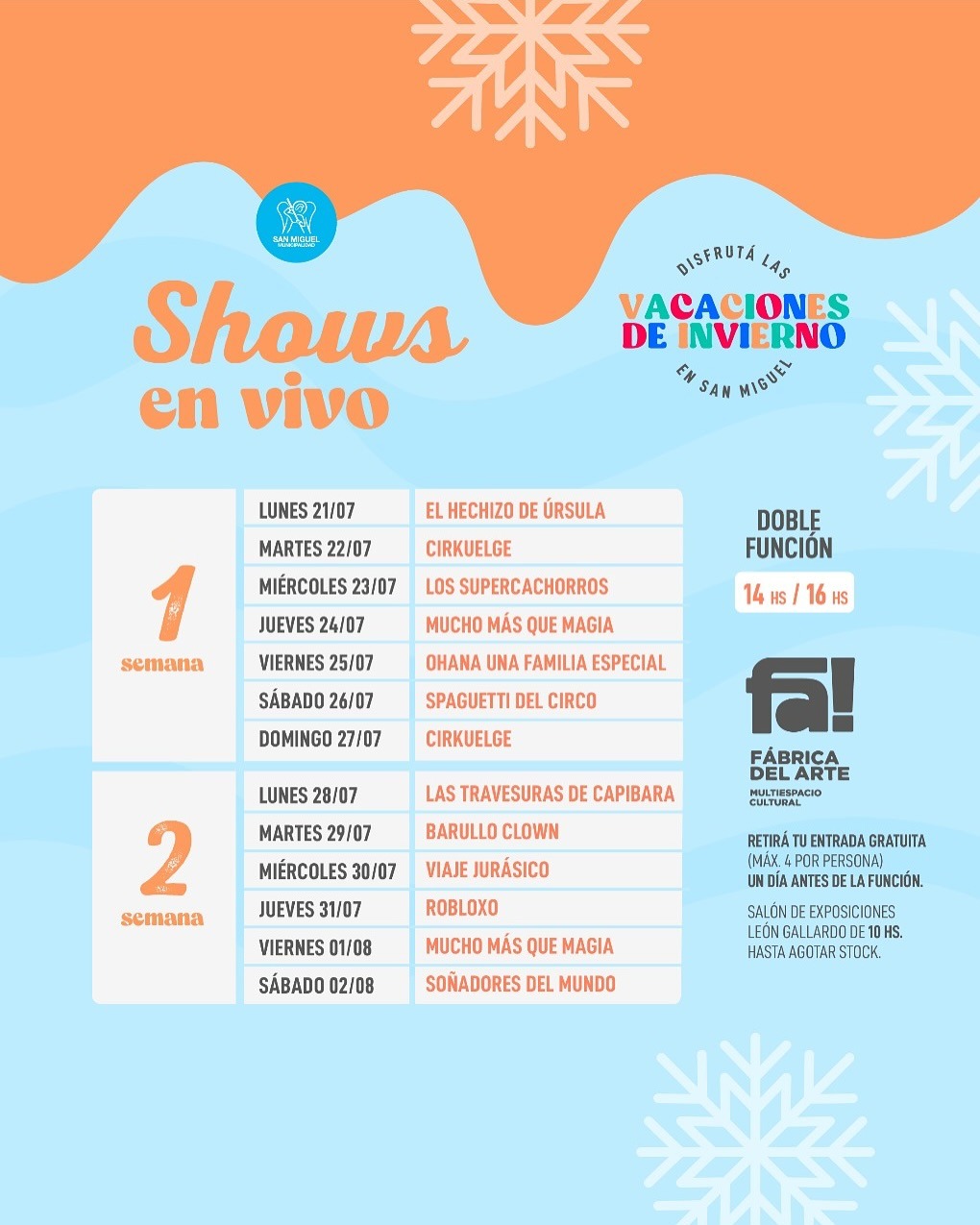 Habrá distintos tipos de shows en la FA (Av. León Gallardo y Camila Rolón), como comedias musicales, espectáculos interactivos, circo y teatro, entre otras obras, con dos funciones diarias (a las 14 y a las 16 hs), del 21 de julio al 2 de agosto. Las entradas son gratuitas y deben retirarse el día anterior al espectáculo, entre las 10 y las 14 hs, en el Salón Municipal de Exposiciones León Gallardo (Av. León Gallardo y Camila Rolón).
