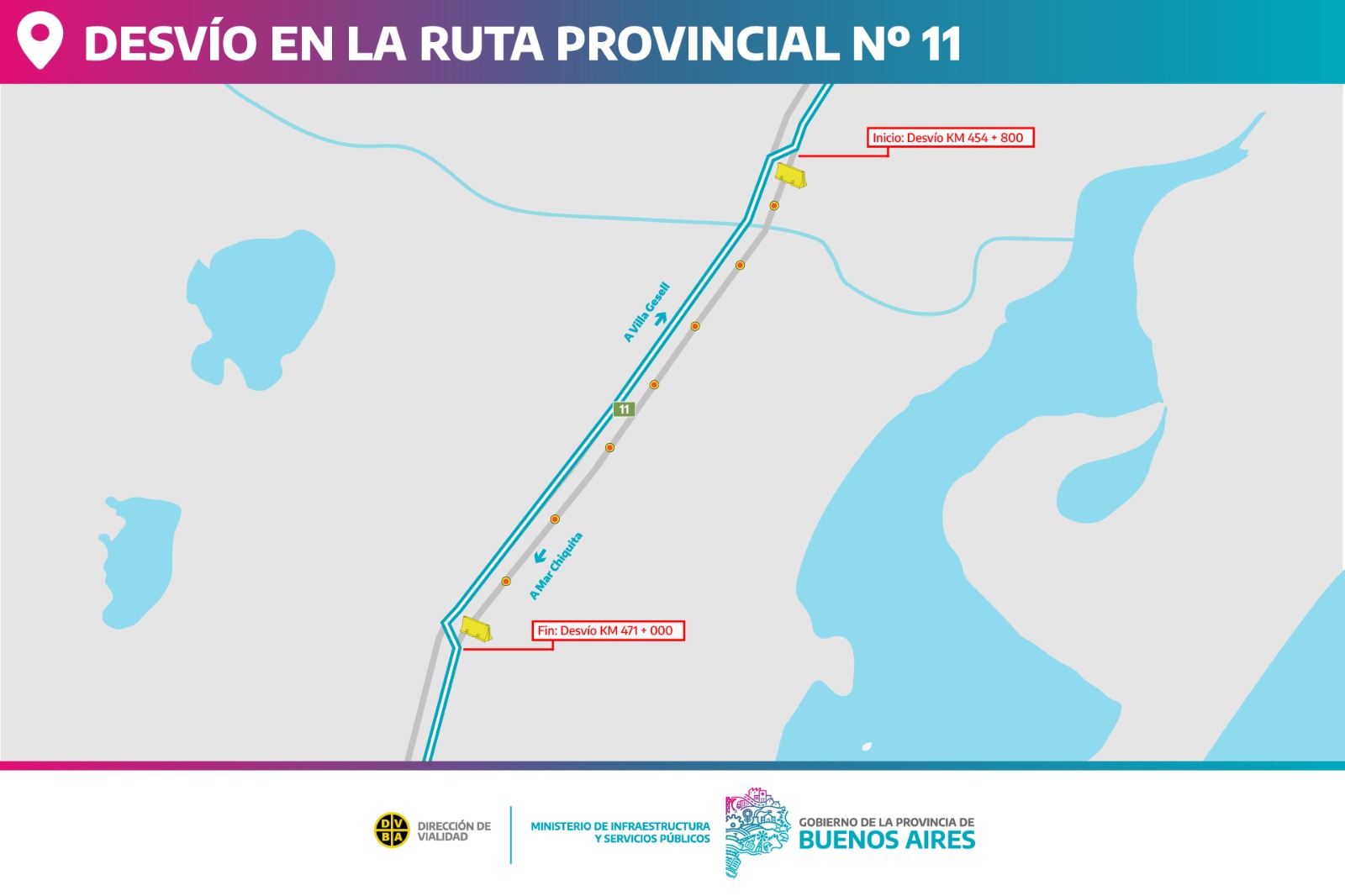 La Dirección de Vialidad de la Provincia de Buenos Aires, dependiente del Ministerio de Infraestructura y Servicios Públicos, comunica que a partir del miércoles 30 y debido a la construcción de la segunda calzada en la Ruta Provincial N° 11, se generará un nuevo corte y desvío.