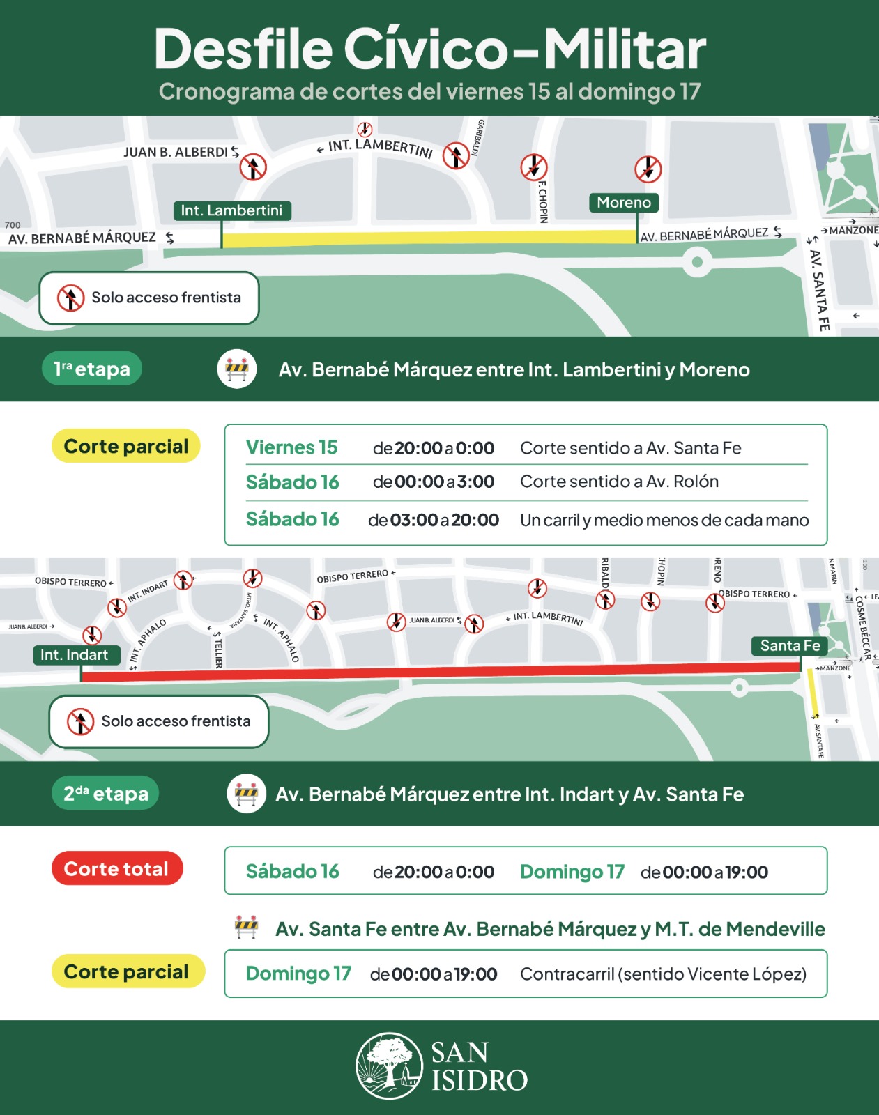 Por el evento se realizarán cortes de tránsito (VER MAPA). Habrá dos etapas de cortes: los parciales serán el viernes 15, de 20:00 a 00:00 en la avenida Márquez entre Int. Lambertini y Moreno, en sentido a Av. Santa Fe. Luego, el sábado 16 de 00:00 a 3:00, en Márquez en sentido a Av. Rolón; y de 3:00 a 20:00 se cortará el tránsito en un carril y medio de cada mano.