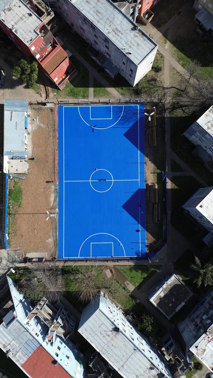La cancha es de hormigón de 24 x 45 metros. Las obras consintieron en el movimiento de suelos y continuó con la etapa de hormigonado, de demarcación, y pintura.