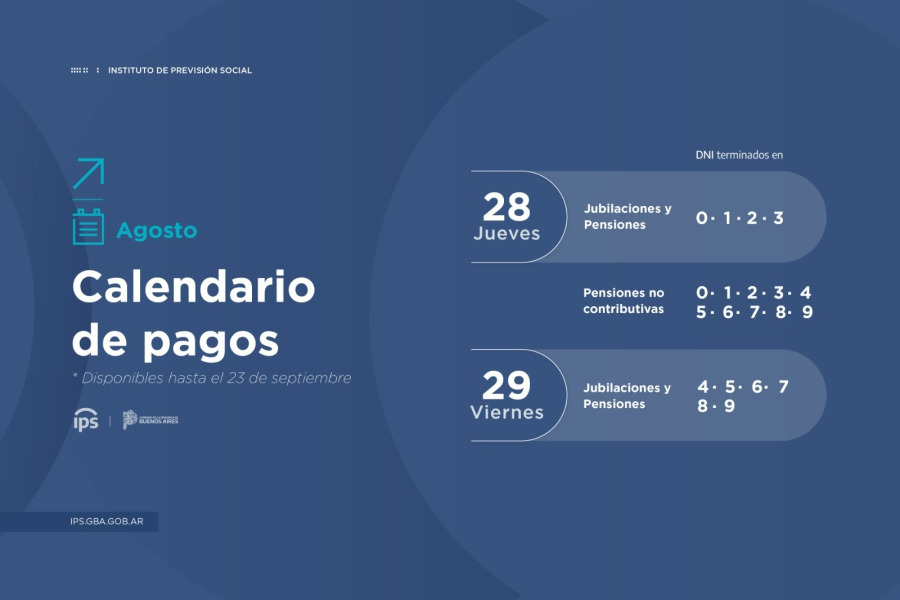 El Instituto de Previsión Social (IPS) informa que las personas jubiladas y pensionadas de la provincia de Buenos Aires percibirán los haberes del mes de agosto los días jueves 28 y viernes 29 del corriente, según cronograma que se detalla a continuación: