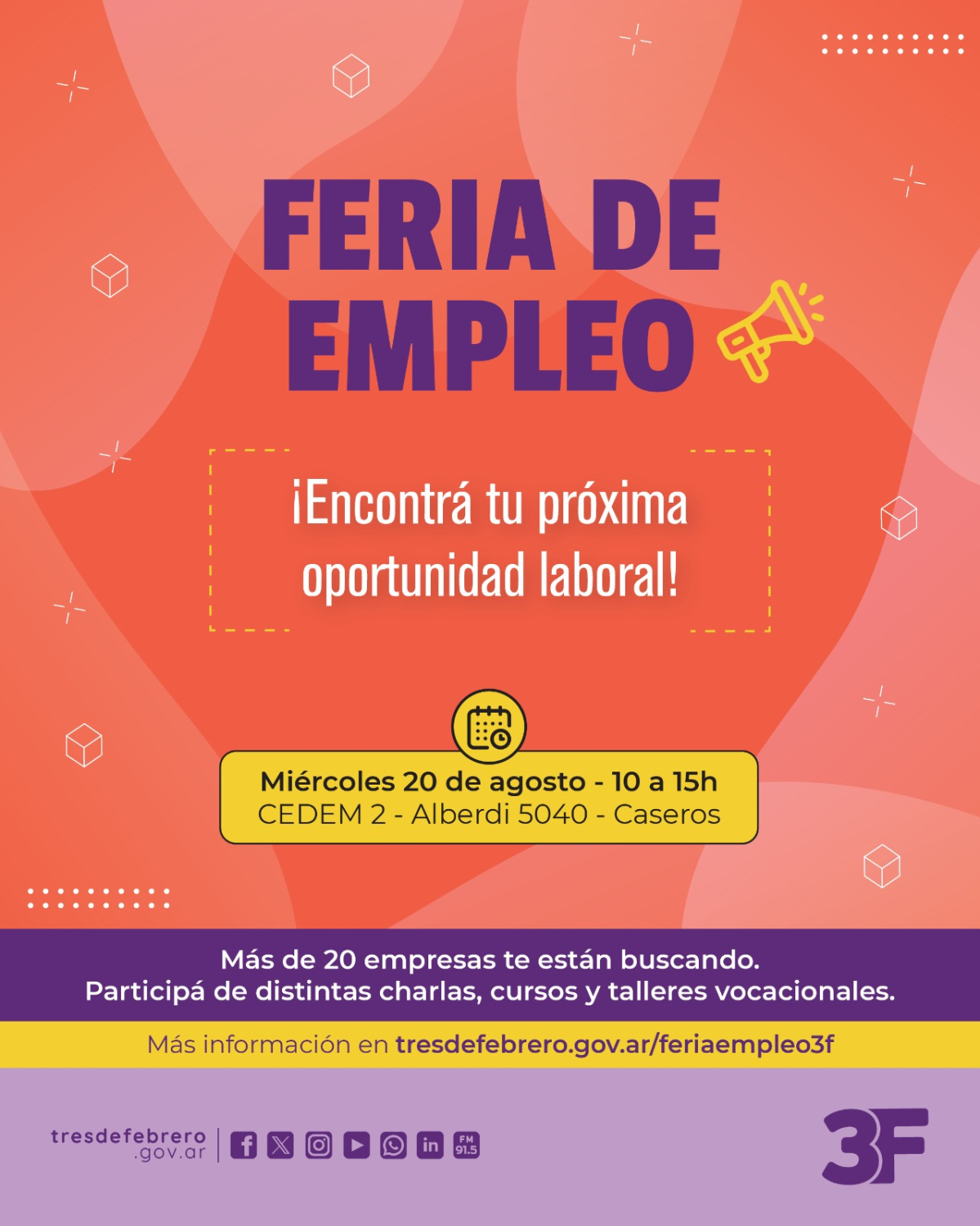 La Feria de Empleo es un evento importante en Tres de Febrero, donde convocan a todos los vecinos que quieran obtener su primer trabajo o busquen darle un nuevo rumbo a su vida laboral. La actividad será realizada el miércoles 20 de agosto de 10 a 15 h en el CEDEM 2 (Alberdi 5040 – Caseros).