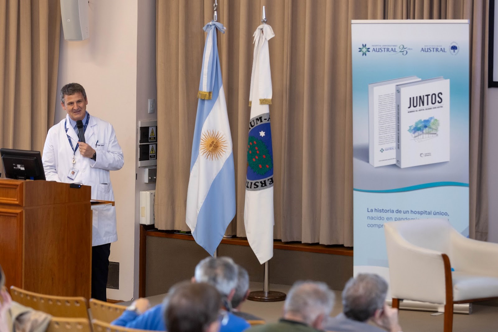 El jueves 21 de agosto, el Hospital Universitario Austral presentó el libro “JUNTOS: Memorias del Hospital Solidario COVID Austral», un relato emotivo sobre la creación y el trabajo de un centro de atención levantado en plena emergencia sanitaria para asistir a víctimas del COVID-19. La obra colectiva reúne las voces de médicos, enfermeros, gestores, voluntarios, pacientes y familiares, cuyas experiencias dan cuenta de la resiliencia, la entrega y el esfuerzo sostenido del hospital durante 2020 y 2021. Su versión digital es gratuita y puede descargarse en la web del Hospital. La presentación institucional se realizó en el auditorio del Hospital, donde estuvieron presentes sus protagonistas; entre ellos, médicos, enfermeros, autoridades del Hospital y de la  Universidad y el equipo que estuvo a cargo de la redacción del libro.