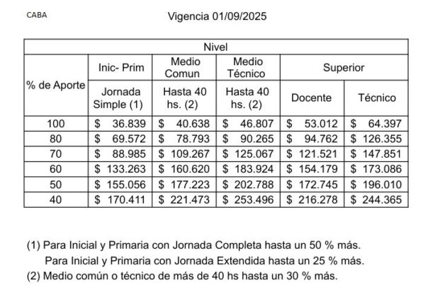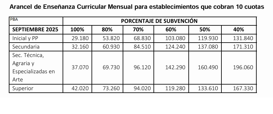 La Asociación de Institutos de Enseñanza Privada de Argentina (Aiepa) informó a todos sus asociados que las autoridades de la Provincia de Buenos Aires (PBA) y la Ciudad Autónoma (CABA) autorizaron nuevos cuadros tarifarios que regirán en septiembre en los establecimientos que reciben aportes estatales para afrontar parte de los gastos de funcionamiento.