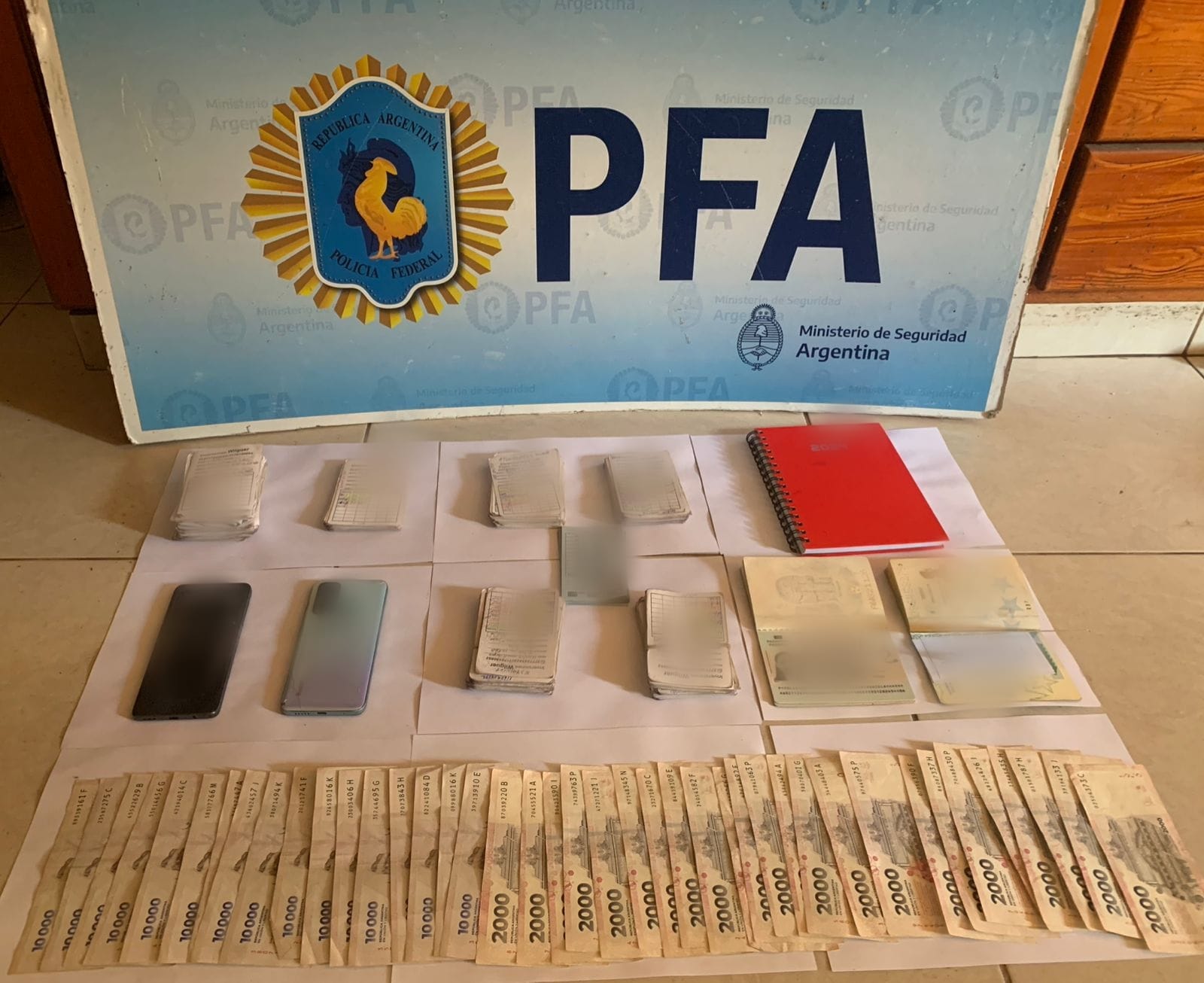 También fueron incautados más de 13 millones de pesos en billeteras virtuales, $980.000, una camioneta, un automóvil, 2 motos, 254 muebles, una máquina de contar billetes, una notebook, 8 celulares, varios carros metálicos de acarreo y documentación de interés para la causa.