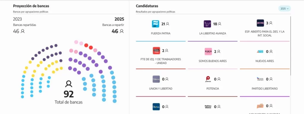 En el Senado, Fuerza Patria quedó cerca del quórum ya que consiguió 13 de las 10 bancas y, como tenía 11 bancas con mandato hasta el 2027, tendrá un bloque de 24 sobre 46 que conforman ese cuerpo legislativo.