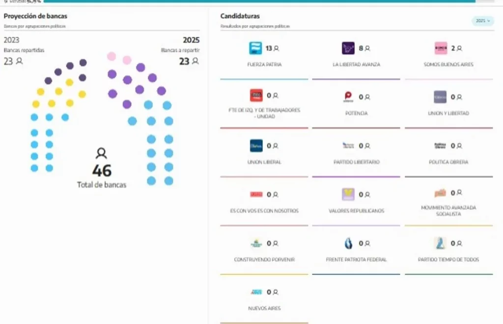 En tanto, se eligieron senadores en estas secciones: ocho en la Primera, ubicada en el norte del conurbano; 7 en la Cuarta Sección, en el noroeste bonaerense; 5 en la Quinta Sección, que abarca la costa atlántica, y 3 en la Séptima, en la zona centro del interior.