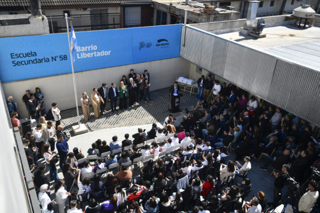 El gobernador de la provincia de Buenos Aires, Axel Kicillof, encabezó este viernes la inauguración formal de la Escuela Secundaria N°58 en el municipio de San Martín. Fue junto a la vicegobernadora Verónica Magario; el director general de Cultura y Educación, Alberto Sileoni; el intendente local, Fernando Moreira; el dirigente Jorge Taiana; y la directora de la institución, Cecilia Bogado.